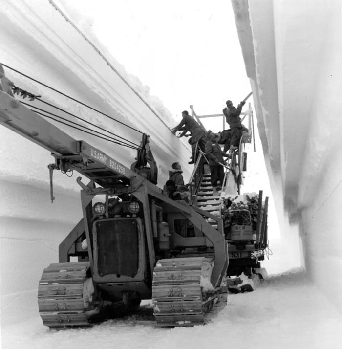 1959年到1961年,数百名美国军事工程师和技术人员从格陵兰岛西北海岸的图勒空军基地出发,跋涉150英里,在冰雪中进行挖掘,建造了一座由核反应堆提供核心能源的“地下城市”,里面有宿舍、办公室、理发店、洗衣房、图书馆和淋浴间,可容纳约200名士兵。